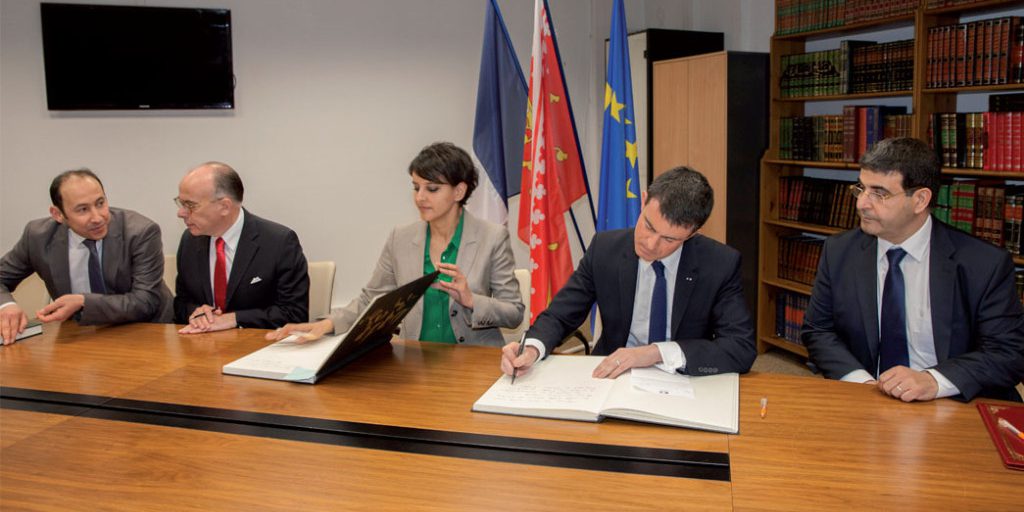 De gauche à droite : M. Lahcen Sarrou, Trésorier de la GMS, M. Bernard Cazeneuve, Ministre de l’Intérieur, Mme Najat Vallaud-Belkacem, Ministre de l’Éducation Nationale, M. Manuel Valls, Premier Ministre, Ali El Jarroudi, Président de la GMS.