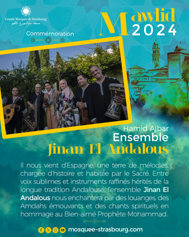 Au palais des congrès, nous voyons les choses en GRAND pour célébrer notre amour pour le Prophète Mohammad, paix et salut sur Lui. Ainsi nous sommes honorés de vous présenter le groupe Jinan El Andalous qui nous viendra tout droit d’Andalousie en Espagne 🇪🇸, pour animer la soirée au Palais des Congrès de Strasbourg.